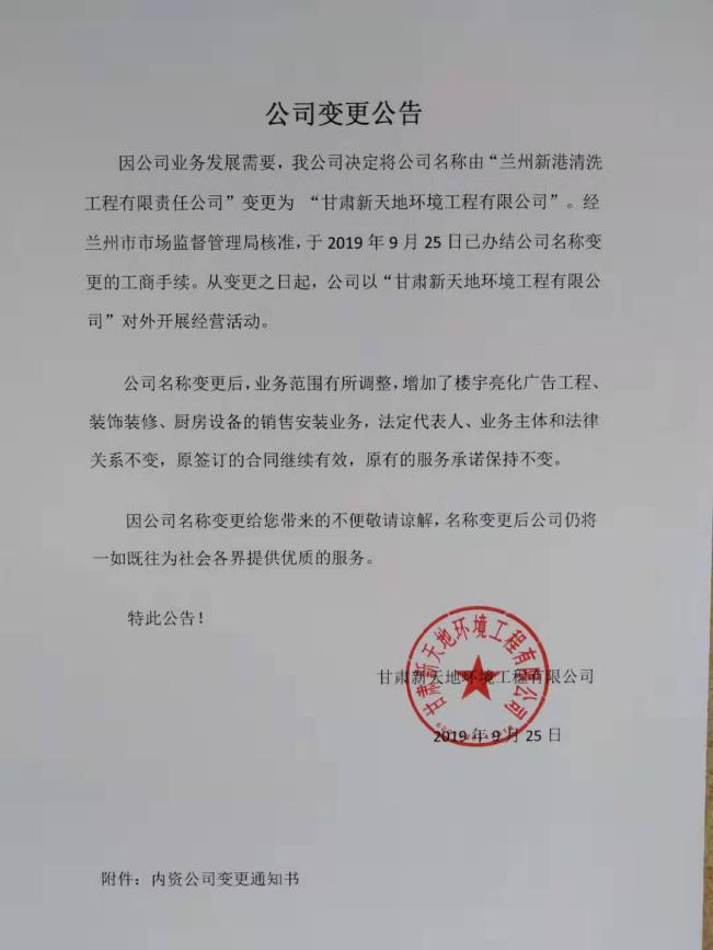 我公司更名為“甘肅新天地環(huán)境工程有限公司”